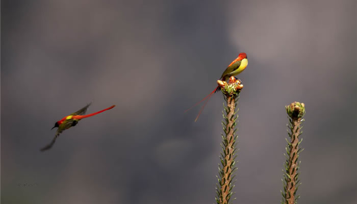 据老怀介绍,每年5月-7月上旬,轿子山漫山遍野的黄、白、红、粉色的各种杜鹃花盛开,这位神密客人——火尾太阳鸟,紧随杜鹃花开的步伐悄悄地来到了轿子山海拔3500米左右的花海中,开始了它们的繁殖季。这时,雄鸟们换上了艳丽的新衣,墨蓝近黑的头部配上一双明亮的眼晴,一张又弯又细又长的嘴巴;那身洋红的外套从肩披至尾捎;鹅黄的马甲,胸前一抹心形的亮红;尤其那飘逸细长双羽分叉的长尾,在花丛中冷杉林中红色闪电般窜飞,迷倒了全国的鸟友。此时全国各地的鸟友们带上“长枪短炮”,呼朋唤友前去轿子山就为了一睹火尾大阳鸟的倩丽身影。