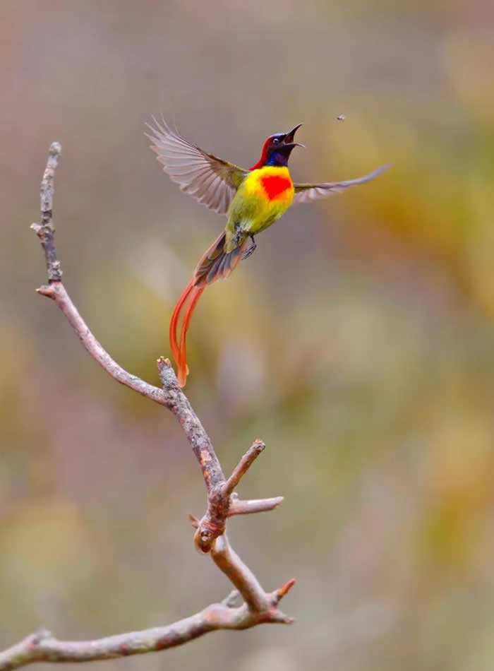 火尾太阳鸟,这种因美貌而吸睛能力强大的高山鸟类,主要分布在东南亚和南亚国家,中国的西藏和云南也有栖居。它们小巧玲珑,羽毛鲜艳美丽,是轿子雪山鸟类大家族中的流量明星。火尾太阳鸟中雄鸟是鸟群中的颜值担当,红色,有一根帅破天际的艳猩红色中央长尾羽。雌鸟要则低调朴素很多,呈灰橄榄色,腰黄,体型比雄鸟小。